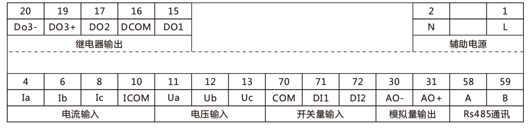 直流4~20mA的模擬量輸出,可設(shè)置對應(yīng)電動機(jī)三相電流、零序電流、三相線電壓;