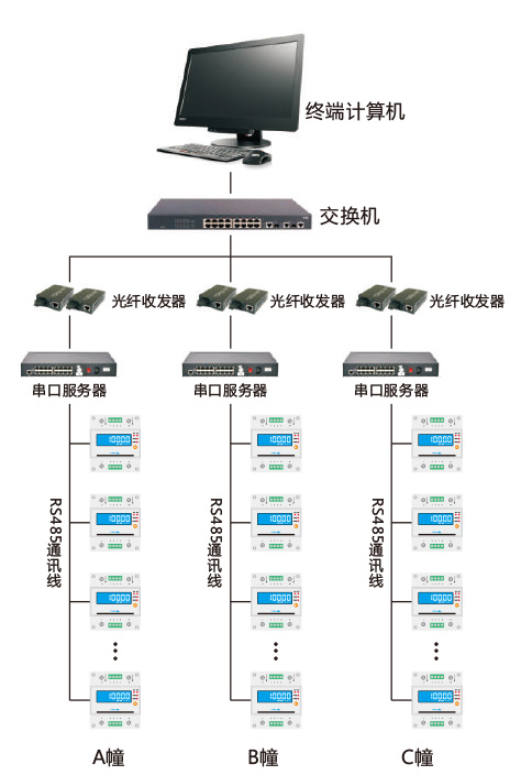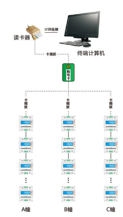 實現點線點布局,接線方式清晰明了,方便后期排查用電問題原因,終端計算機只需要一根網線就可以對所有電表進行開戶、售電、銷戶等所有售電操作。