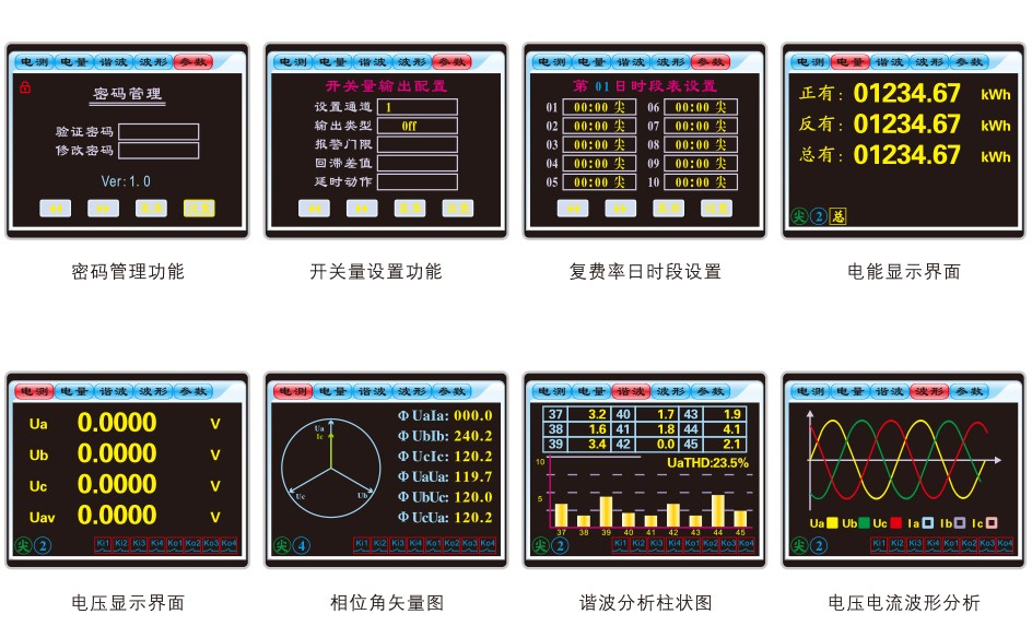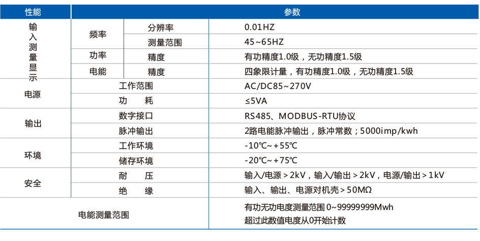 測量:三相相電壓、線電壓、電流、總有功功率、總無功功率、總功率因數(shù)、總視在功率、有功電能、 無功電能。
